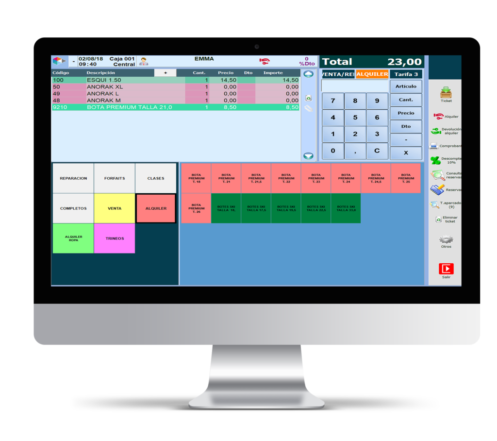 Alquiler TPV ALQUILER La forma más práctica y sencilla de resolver la gestión y administración de su negocio El Terminal Punto de Venta de System es un software líder en el mercado del comercio y forma parte como modulo de una amplia gestión (ERP).Su principal virtud es su simplicidad tanto a la hora de vender, configurar o modificar funcionalidades. Es una herramienta imprescindible para cualquier comercio que quiera controlar de manera total toda su gestión a nivel de ventas, clientes, etc. Información técnica CARACTERISTICAS: Multiempresa/multiidioma.Opciones de alquileres y devoluciones de artículos, por fechas o por temporada.Cobro al efectuar el alquiler o en la devolución de los artículos.Posibilidad de avanzar o prolongar la devolución de los artículos del alquiler.Introducción automática de los datos de clientes mediante la digitalización de documentos oficiales (DNI, pasaporte, carné de conducir, etc.)Hay más! Descúbrelas! Catàleg CAT Catálogo ESP Lector de código de barras Entre y busque los artículos de manera rápida mediante un escáner de código de barras. Tiempos de espera Agilice todas las operaciones y procesos de cambio y así los tiempos de espera de sus clientes. Fácil de usar Diseñado con un sistema fácil de utilizar. Visualizará los productos rápidamente en la pantalla de ventas. Ejemplos reales Escola Cota 2.500 (La Molina)